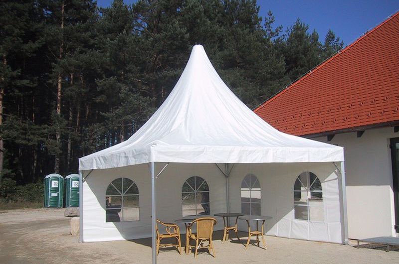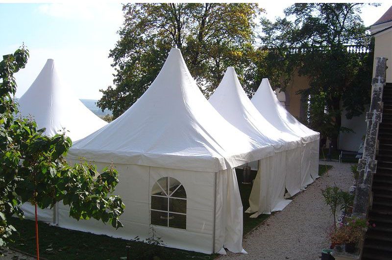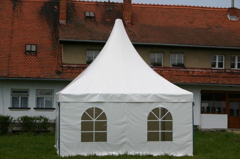 Párty stany typu pagoda se střechou do špice a rozměrem 5 x 5 m Z obou těchto typů je možné vytvořit unikátní sestavy,  plnící  Vaše prostorové představy a potřeby